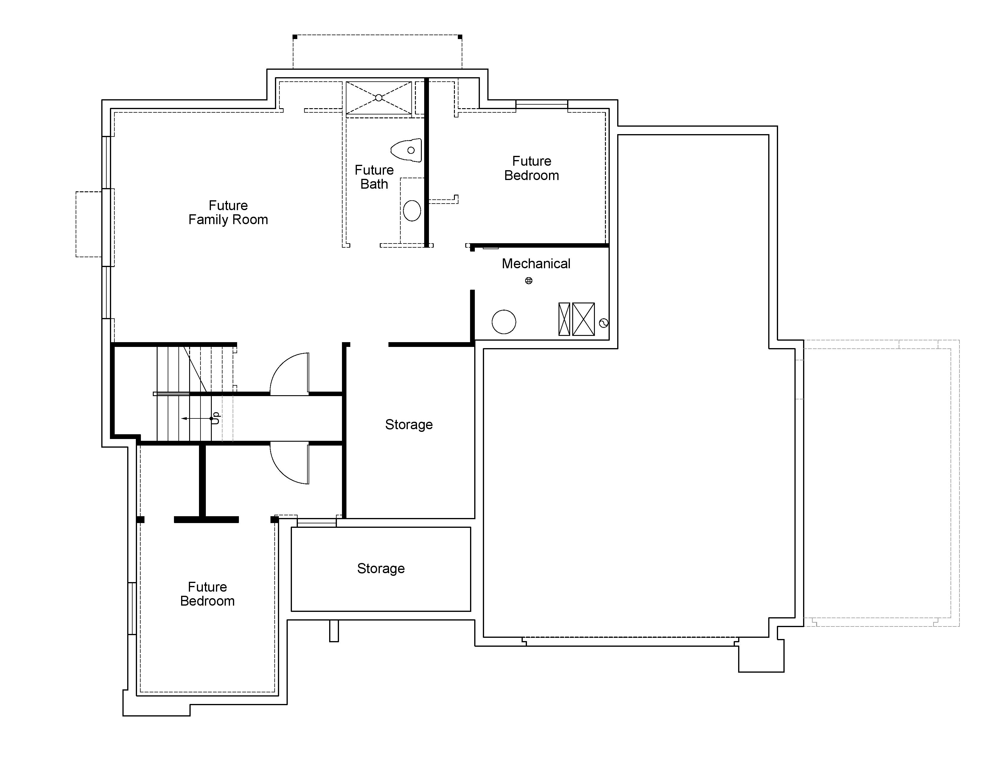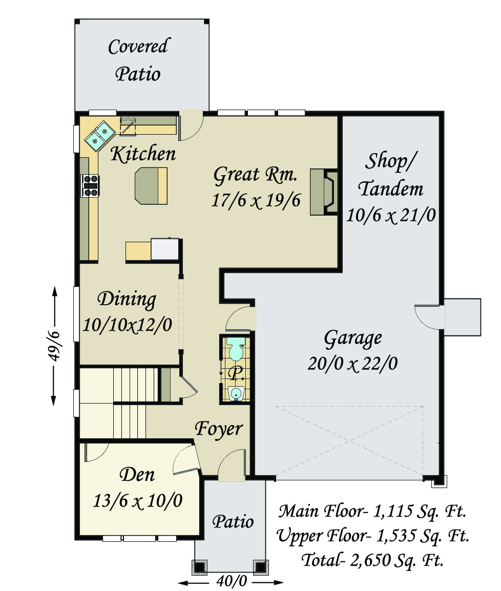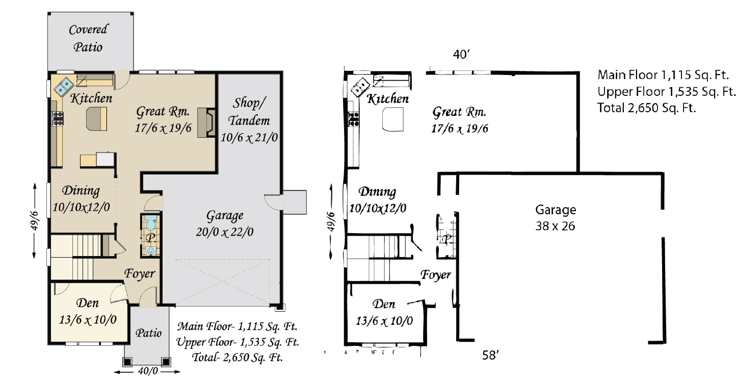 This house plan with basement would be about 3700 sq. ft. Main floor is 1,225 sq. ft. My drawings show adjustment to increase garage size, extend Great room, and make a big creative room for Jina upstairs.